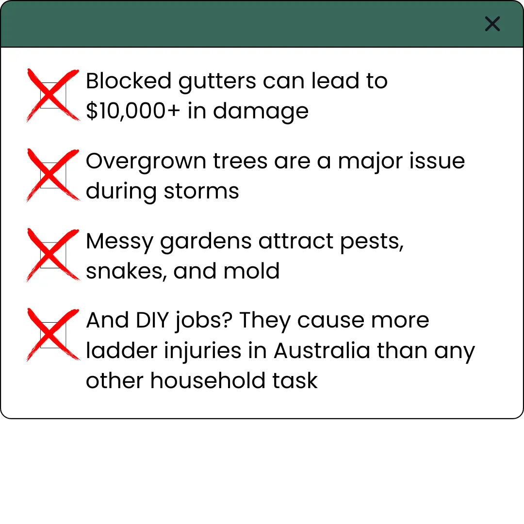 That’s what most homeowners say until their lawns a mess or a blocked gutter floods the roof cavity… You already know your yard’s overdue for maintenance, but life’s busy. And let’s be honest, ladders, chainsaws, and cleanup? Not how you want to spend your weekend.
